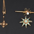 A gold, turquoise and seed pearl set brooch, designed as a starburst, a gold and pale blue gem set brooch with a spider motif, two gem set bar brooches, a diamond set stick pin and three various pendant necklaces.