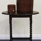 A Far Eastern bamboo and wicker food container, a similar cylindrical box and a George V oak table.