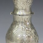 A Danish silver baluster sugar caster with domed cover, decorated in relief with angels, foliate scrolls and inscribed 'Ebba Gunlov Rosenvinge 1793', on a circular foot, height approx 20cm.