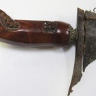 A Malayan wavy bladed kris with watered blade, length approx 33cm, slab sided hardwood grip, in its brass and copper covered hardwood sheath.