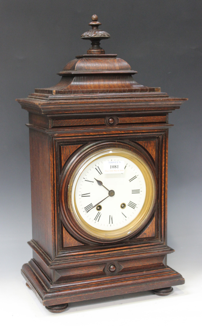 A late 19th Century German oak cased mantel clock with Lenzkirch eight day movement striking on a gong, the enamel dial with Roman numerals, the case with carved and turned finial, on a rectangular base and bun feet, height approx 51cm, with pendulum.