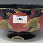 A Moorcroft pottery circular footed bowl, circa 1914-1916, decorated with Pomegranate design against a blue ground, on a circular foot, impressed Cobridge factory mark and shape No. '854' and painted signature to base, height approx 10.5cm (chips with loss to foot).