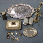 A late Victorian plated two handled tea tray with engraved decoration within a beaded and scallop shell rim, together with a small collection of other plated items, including a pair of candlesticks and an entrée dish, cover and handle.