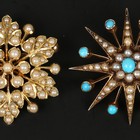 A gold and seed pearl set pendant brooch in a hexagonal foliate open-work design, width approx 3cm, and a gold, turquoise and seed pearl set pendant brooch, designed as a starburst, width approx 3cm.