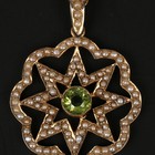 A 9ct gold, peridot and seed pearl set shaped circular pendant, Birmingham 1910, length approx 3.7cm, with a multiple link neckchain on a bolt ring clasp.
