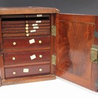 A mahogany coin cabinet, fitted with six small drawers and three large drawers (one small drawer lacking).
