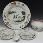 A Chinese famille rose export porcelain circular dish, Qianlong period, the centre painted with a pavilion, bridge and trees in a coastal landscape within a gilt barbed frame and flowers to the rim, diameter approx 38cm, together with a small collection of Chinese export porcelain, 18th Century, including two famille rose plates and a famille rose bowl (faults).