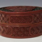 A Chinese cinnabar lacquer circular box and cover, Qianlong period, the top carved in relief with a basket of flowers on a green trellis ground, the sides with wan diaper panels on a trellis ground, diameter approx 7.5cm (minor restoration).