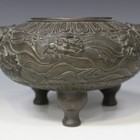 A Chinese brown patinated bronze tripod censer, mark of Xuande but 19th Century, of compressed circular form, cast with mythical animals emerging from a turbulent sea, between grimacing lion's head handles, cast pseudo seal mark of Xuande to base, width across handles approx 21cm.