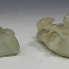 A Chinese pale celadon jade carving, 20th Century, modelled as two birds sharing a lingzhi fungus branch in their beaks, length approx 8.8cm, together with a similar carving of a Buddhistic lion, length approx 6cm.