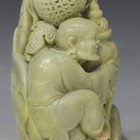 A Chinese green soapstone carving, early 20th Century, finely carved as three luohan supporting a jar and cover and pierced ball, height approx 21cm.