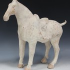 A Chinese painted pottery figure of a horse, probably Tang Dynasty, modelled standing four square with saddle, height approx 39cm (repairs).