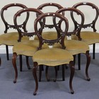 A set of six mid-Victorian mahogany spoon back dining chairs with carved centre rails and overstuffed seats, on cabriole legs, height approx 87cm, width approx 48cm.