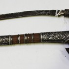 A 19th Century Malayan white metal mounted and horn handled bade-bade, the grip and throat of sheath probably carved from rhino horn, the wooden sheath with applied mounts, total length approx 26.5cm. Note: as this lot probably incorporates rhinoceros horn, it would be very unlikely that a re-export certificate would be granted beyond the EU. Customers outside the EU are requested NOT to bid on this item.