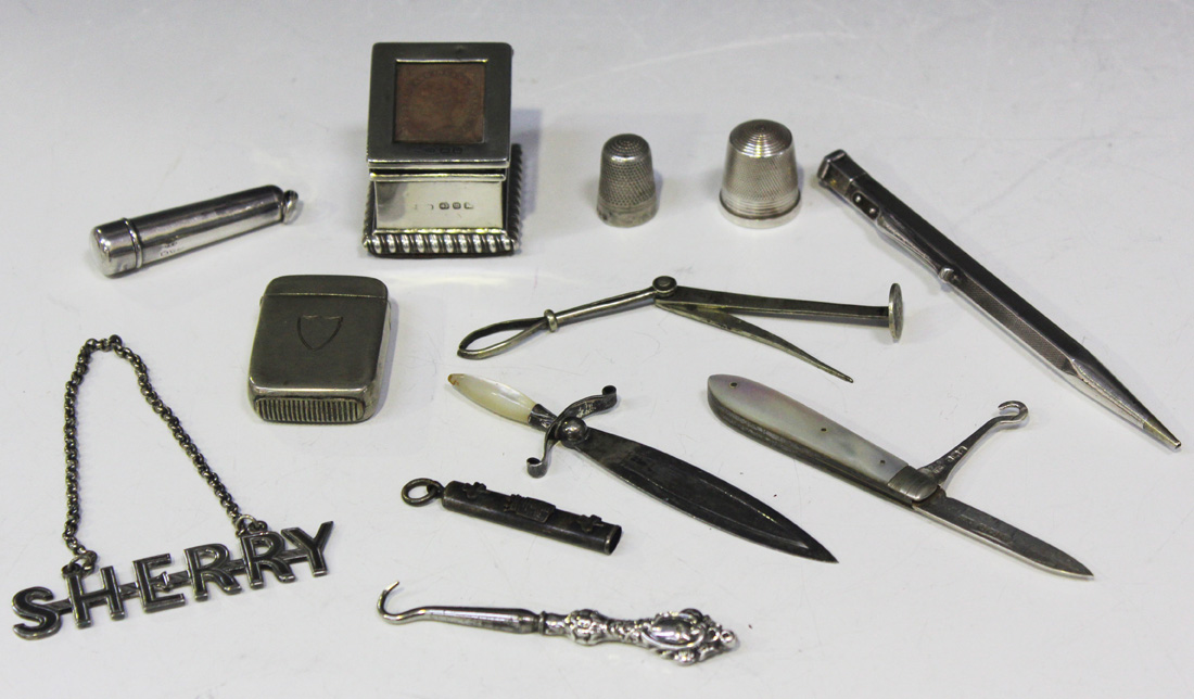 A Victorian silver stamp box with glazed hinged lid, ¦Birmingham 1896, a silver and mother-of-pearl folding pocket button hook and fruit knife, Sheffield 1905, a Victorian base metal vesta case, a Victorian silver and mother-of-pearl book marker, Birmingham 1887, two silver thimbles, a button hook with a silver handle, Birmingham 1903, a silver cheroot holder case, a silver cased pencil, a pencil holder, a plated 'Sherry' decanter label and a smokers implement.