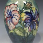 A Moorcroft pottery vase, circa 1949, of ovoid form decorated with Hibiscus design against a shaded light to dark blue ground, impressed factory mark and painted initials to base, height approx 17.5cm.