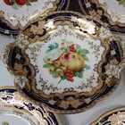 A Ridgway porcelain part dessert service, circa 1850, comprising seven plates and a pair of low comports, each piece finely painted with fruit within a rim of gilt and peach scrolls and vines on a blue ground, iron red painted pattern number '6' over '4165' to bases, plate diameter approx 23.5cm.