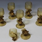 A set of six Venetian amber tinted gilt flecked wine glasses, each spiral fluted bowl on a dolphin stem and circular foot, height approx 13cm (one damaged).