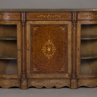 A mid-Victorian burr walnut and boxwood inlaid credenza, the galleried top above a panelled door, flanked by bowfront glazed cabinets, on a plinth base, height approx 112cm, width approx 177cm, depth approx 47cm.