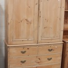 A Victorian pine linen press, fitted with a pair of arched panel doors above two short and two long drawers, on a plinth base, height approx 212cm, width approx 117cm, depth approx 47cm.