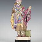 A Charles Vyse pottery figure of In Petticoat Lane, introduced in 1938, modelled as a standing Arab wearing a pink turban and long brown coat, carrying colourful ties, scarves and shawls in his arms, with suitcase at his feet, on an octagonal paved flagstone base, incised 'Vyse Chelsea' to side of base, height approx 33cm. Note: this figure has an alternative title of The Pedestrian Bazaar.