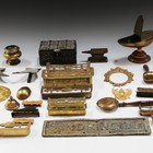 A collection of Victorian brass collectors' items, including eight doll's house fenders, a medieval style casket, a pair of pressed gilt metal circular panels of birds perched by their nests, and a pressed metal sign bearing 'Sandringham', length approx 32cm.
