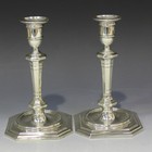 A pair of Edwardian silver candlesticks, each with urn shaped sconce above a tapering octagonal knop stem and octagonal base, Sheffield 1908 by James Dixon & Sons, height approx 20cm.