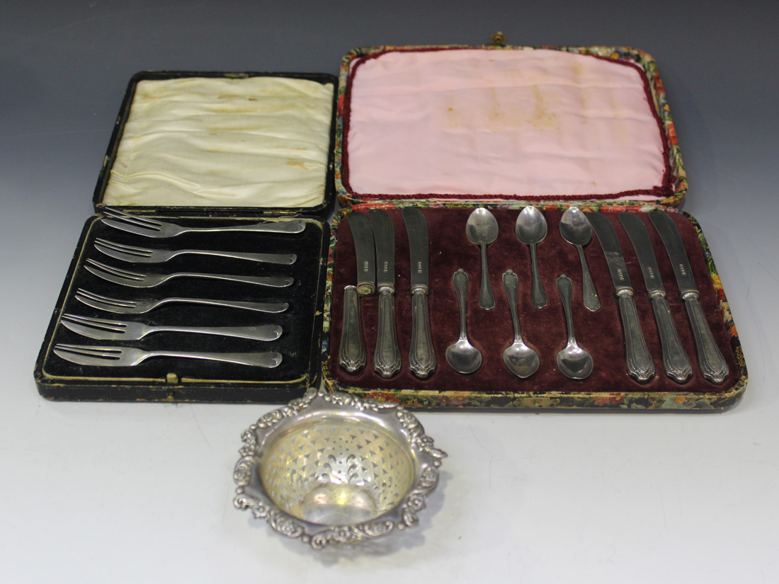 An Edwardian silver circular bonbon dish, with pierced sides and floral embossed rim, Birmingham 1903, diameter approx 10.5cm, a set of six silver handled butter knives and matching coffee spoons, Sheffield 1928, 1929 and 1930, cased (faults), together with a set of silver cake forks, Birmingham 1926, cased.