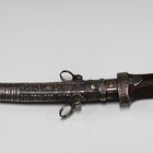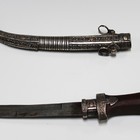 A Middle Eastern white metal mounted jambia with curved part double edged blade, length approx 22cm, hardwood grip, embossed white metal pommel, in its matching embossed white metal sheath, embellished with small gilt applied tablets.