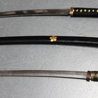 A Japanese curved single edged wakizashi blade, length approx 47.5cm (marks and abrasion), replacement cord bound grip, together with another wakizashi blade, length approx 45cm (poor condition).