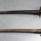 A late 19th Century German made all-steel cutlass with curved single edged blade, length approx 68cm, struck with head trade mark at forte, sheet steel guard, banded steel grip (rust stained), together with a similar all-steel cutlass.