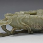 A Chinese celadon jade brush washer, late Qing dynasty, modelled as a lotus leaf with incised detail, the pierced tendril handle surmounted with a frog, length approx 20.2cm, with carved hardwood stand, the apron pierced with lotus and tendrils.