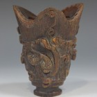 A Chinese rhino horn libation cup, Qing Dynasty, of steep sided form with compressed flat handle to one side, carved in relief with three feline chilong crawling across the central band, under a trefoil rim, on a circular foot with carved shou medallion to underside, height approx 10cm. Note: as this lot incorporates rhinoceros horn, it would be very unlikely that a re-export certificate would be granted beyond the EU. Customers outside the EU are requested NOT to bid on this item.