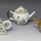 Two Chinese famille rose export porcelain teapots and covers, Qianlong period, each of globular form, one painted with opposing figural scenes, the other with flowers within café-au-lait glazed borders (restoration and faults), together with a Chinese famille verte porcelain teapot, 20th Century, painted with birds and flowers, iron red printed mark to base.
