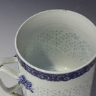 A Chinese blue and white export porcelain tankard, late 18th/early 19th Century, the cylindrical body with rice grain patterned decoration within underglaze blue ruyi head borders, applied with an entwined strapwork handle, height approx 14cm.