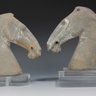 A pair of Chinese grey pottery funerary horse heads, probably Tang dynasty, height approx 16cm, each with perspex stand.