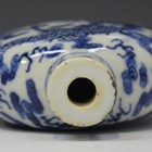 A Chinese blue and white porcelain snuff bottle, mark of Qianlong but late 19th Century, of flattened circular form, painted with dragons chasing flaming pearls amidst vapours, underglaze blue four character mark to base, height approx 9.5cm, with plated stopper.