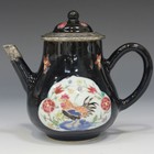 A Chinese silver mounted famille rose black ground export porcelain teapot and cover, Yongzheng period, the low bellied baluster body painted with opposing panels of cockerels and flowers, reserved against a black ground with enamelled and gilt detail, height approx 12.5cm (faults).