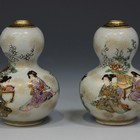 A pair of Japanese Satsuma earthenware diminutive vases, Meiji period, of gourd form, each painted and gilt with two bijin seated at a table and further figures on a gilt speckled grey ground, iron red and gilt signature to base, height approx 6cm.