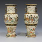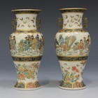 A pair of Japanese Satsuma earthenware vases by Gyokusan, Meiji period, the baluster body painted and gilt with a continuous figural band within simulated brocade, floral and butterfly borders, gilt signature to base of one, height approx 11.7cm (minor restoration to handles).