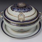 A Chinese export porcelain soup tureen and cover, 19th Century, of oval form, each piece painted in blue and gilt with a cartouche containing initials, within blue and gilt borders, length of tureen approx 34cm (tureen rivet repaired), together with a similar oval stand painted in blue and gilt with an armorial, length approx 37cm.