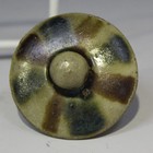 A Chinese Changsha pottery pot and cover, Tang dynasty, of compressed circular form, decorated with brown and green vertical drips on a cream glazed ground, height approx 6.5cm (cover restored).