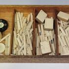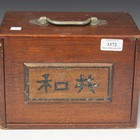 A Chinese mahjong set, 20th Century, with bone and bamboo tiles, within a teak case, the sliding front revealing five drawers, length approx 25.5cm.