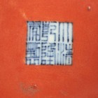 A Chinese iron red glazed porcelain circular brush washer, mark of Qianlong but later, the exterior moulded in low relief with lotus and tendrils, underglaze blue seal mark to base, diameter approx 13cm.