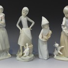 Four Lladro porcelain figures, comprising Girl with Milk Pail, No. 4682, height approx 24cm, Following Her Cats, No. 1309, height approx 25cm (small chip), Girl with Cockerel, No. 4591, height approx 24cm, and Girl with Rooster, No. 4677, height approx 20cm.