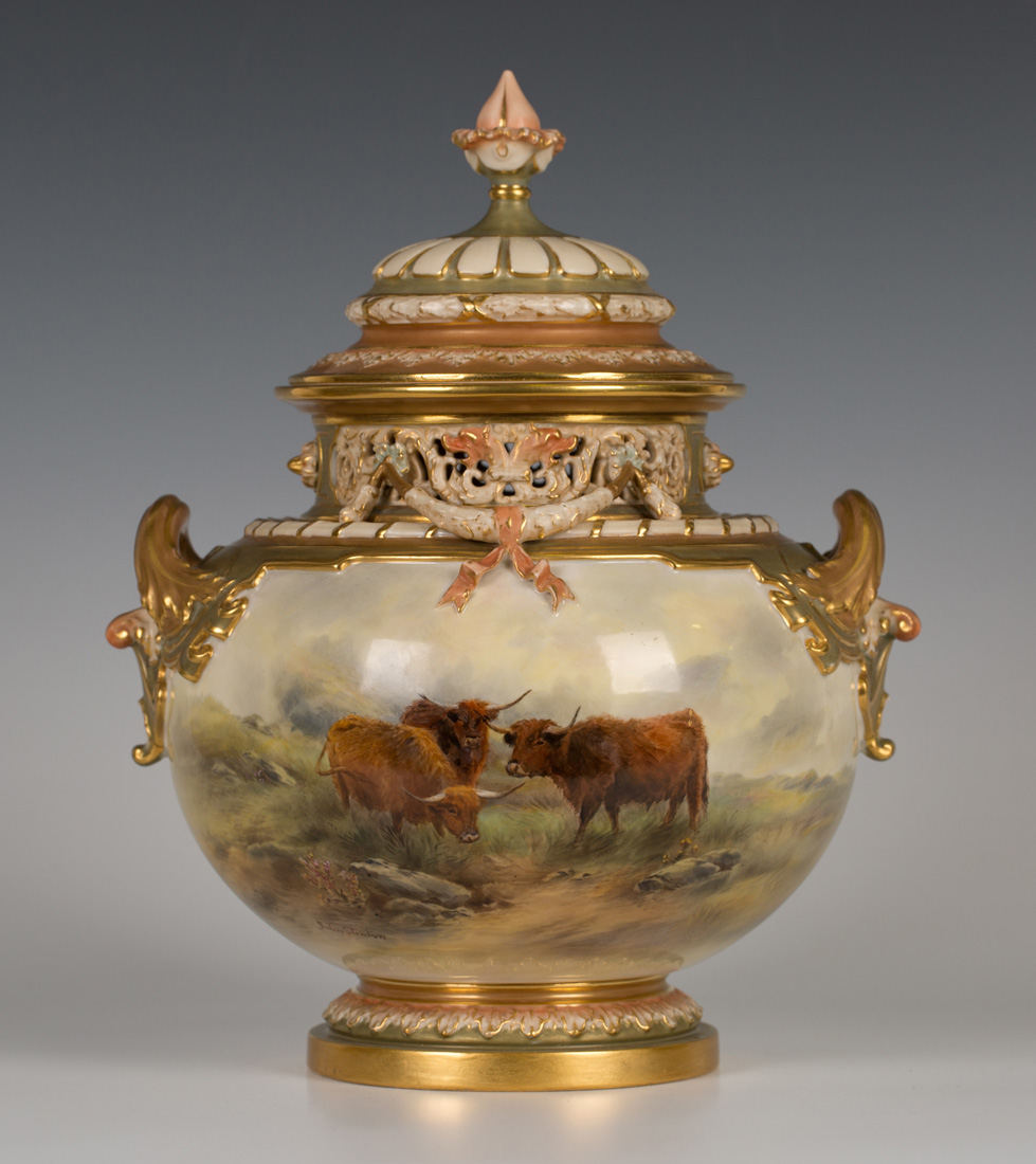 A Royal Worcester bone china squat baluster jar and cover with bud finial, circa 1911, by John Stinton, signed, painted with a scene of Highland cattle beneath a pierced and scroll moulded neck, foliate and ribbon festoons and flanked by gilt foliate moulded handles, puce printed factory mark including '1428' to base, height approx 31cm.