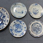 A group of seven Delft blue and white dishes, mid-18th Century, all decorated in the Chinese style with flowers, a figure in the garden and a landscape, diameters approx 30cm to 22cm (faults).