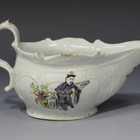 A Phillip Christian of Liverpool porcelain cream or sauce boat, circa 1765-70, moulded in relief with three arched panels to either side, painted in polychrome with Chinese figures, the interior with a large green leaf, length approx 14cm (minor rim chips).