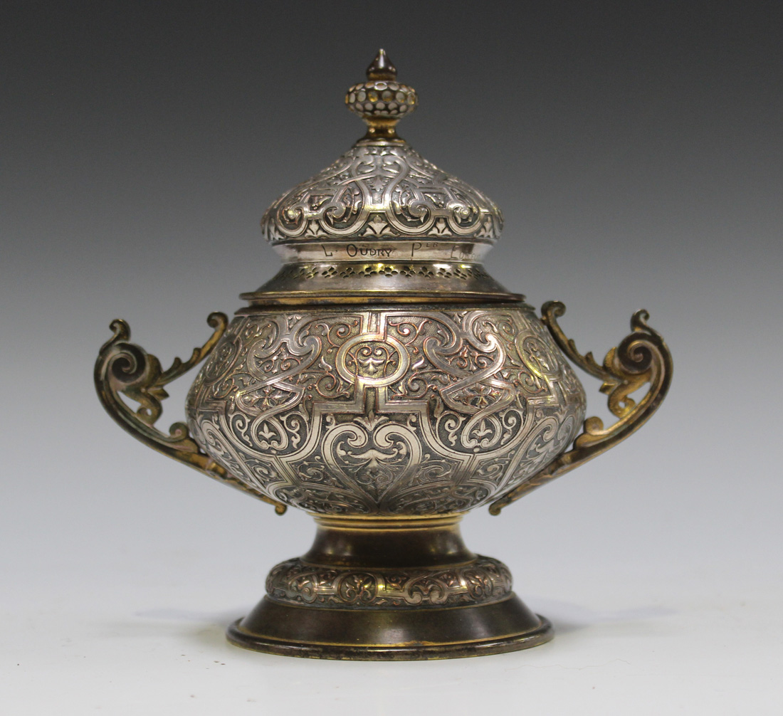 A late 19th Century French Islamic taste silver plated cast bronze inkwell, bearing maker's mark 'L. Oudry Per Editeur', the hinged lid and body cast with bands of foliate strapwork, the sides with a pair of scroll handles, on a circular foot, height approx 14.5cm.