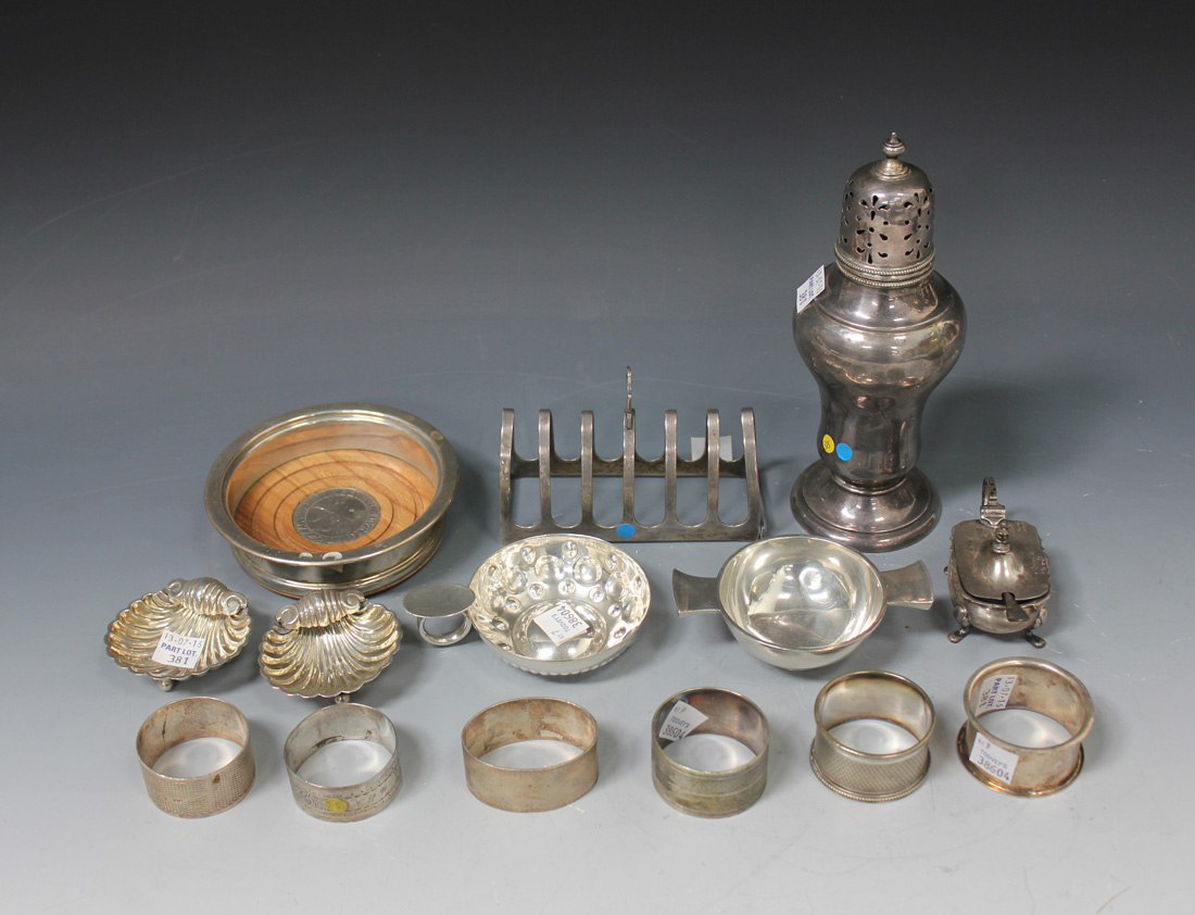 An Indian silver quaich, the circular bowl flanked by two tapering tab handles, on a circular foot, width approx 10.5cm, a pair of scallop shell shaped salts on ball feet, Birmingham 1897 by Henry Williamson, a silver sugar caster with pierced dome cover above a baluster body, on a circular foot, Birmingham 1900, and a collection of other silver and plated items, including a six division toast rack and three plated napkin rings.